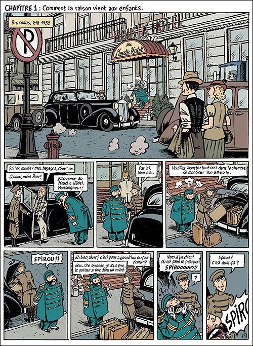 Le récit, doux et tendre, évoque dans sa forme les Bds de l’époque (petite cases carrées, ligne claire « élastique » qui m’a rappelé les tous vieux Disney). Le scénario, habile, joue sur l’ambiance historique, sur la belgitude de Spirou (car il est connu que ces grands héros sont belges !) et sa concurrence supposée avec Tintin… L’album produit une impression intéressante, un peu album de famille plein de photo sépia, un peu boisson fraîche et acidulée, la fin (et l’unique pleine page) apportant leur note de gravité.