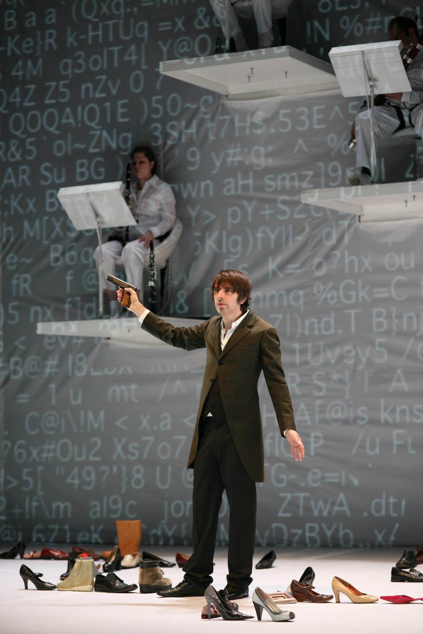Et entendre le texte de Ramuz aura bien été ma seule satisfaction à ce spectacle. La musique de Stravinski m’a parue stridente et énervante. La mise en scène aura été une découverte, pour moi : pour la première fois depuis que je vais au théâtre, j’ai eu le sentiment que ce qu’on voyait sur scène ne servait strictement à rien, n’apportant rien au texte, voire faisant mal aux yeux. Projections pixellisées, chaussures de femme éparpillées sur scène, pistolet/violon, musiciens perchés dans les airs… Je n’ai rien compris, j’ai trouvé ça laid, prétentieux et surtout inutile. Je n’avais pas entièrement adhéré au spectacle de Zimmerman et de Perrot, mais ces deux là au moins savaient composer un univers graphique sur scène.