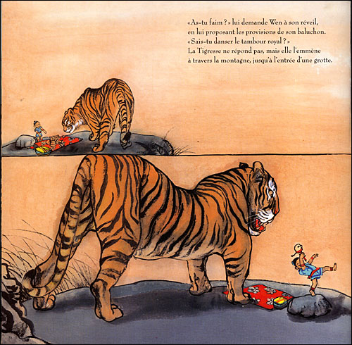 Ce récit est inspiré par une étonnante statuette qu’on peut voir au musée Cernuschi, à Paris : la tigresse.  Tout l’album tourne autour de cette image, l’enfant dans la bouche du monstre.