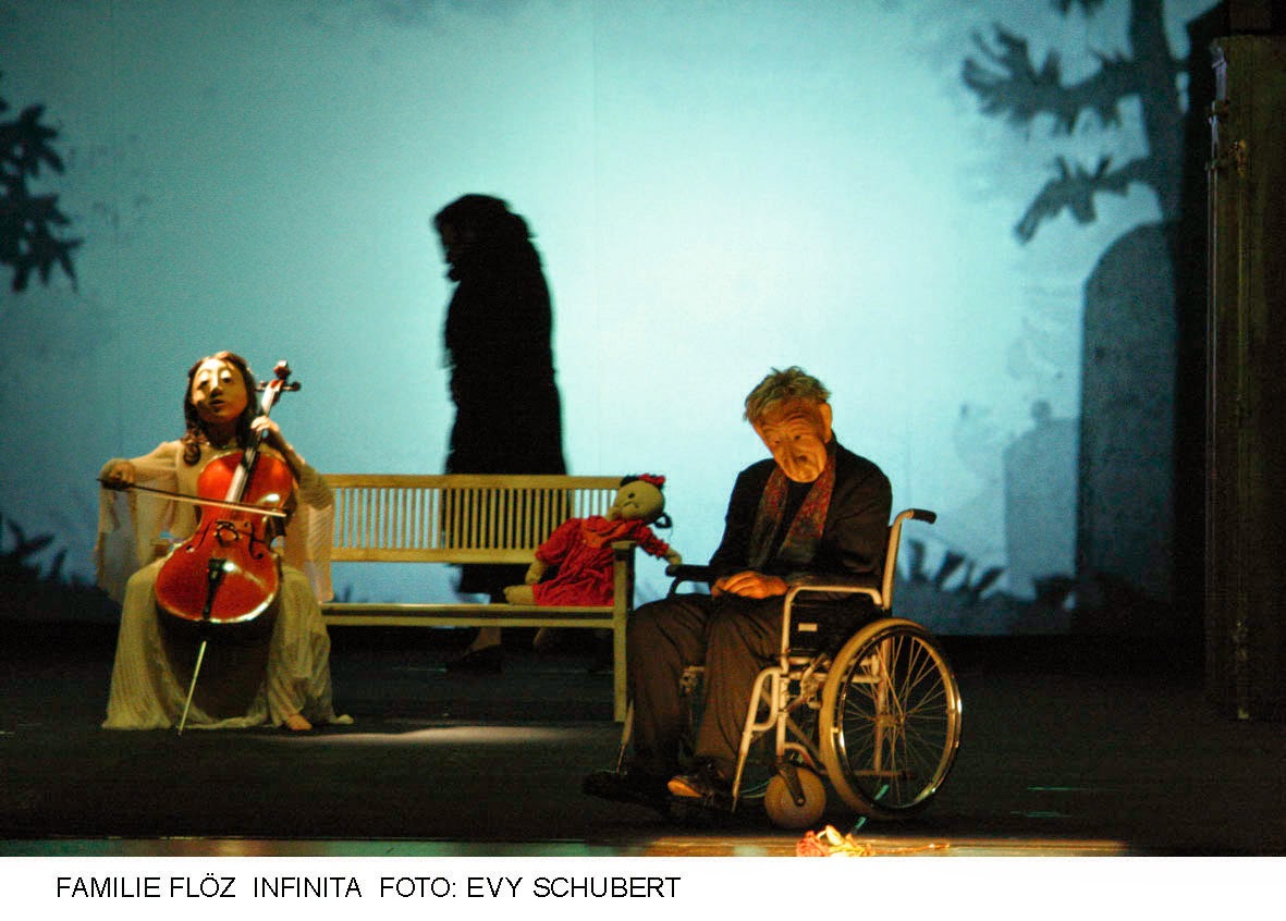 Au fond de la scène, un écran, une projection (encore !) nous montre un enterrement. Puis les personnages entrent en scène, un vieil homme en fauteuil roulant poussé par une grande femme, venu déposer une rose dans une tombe figurée par un carré de lumière… Ca ne va pas être gai.