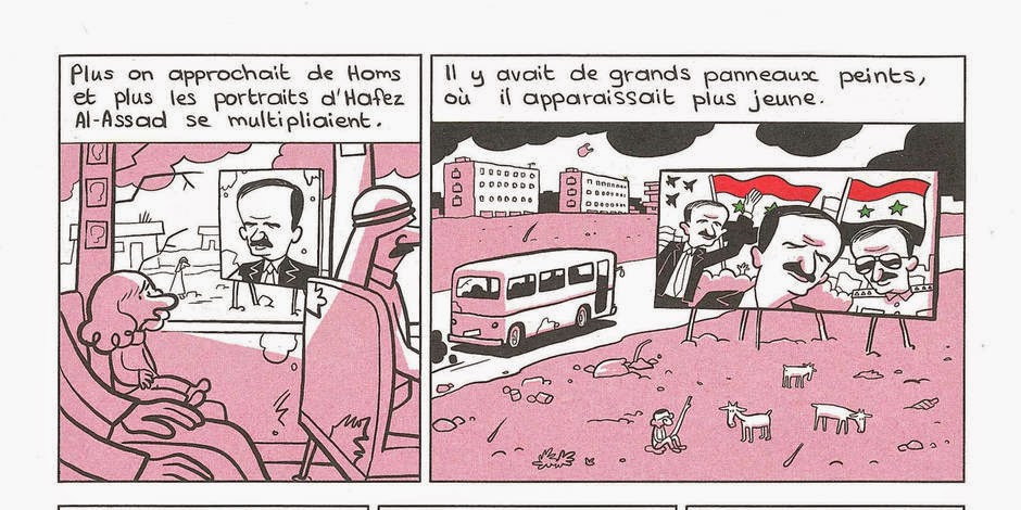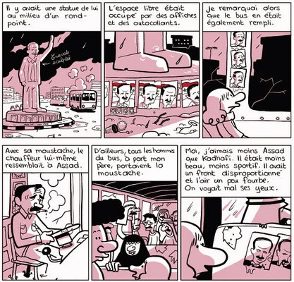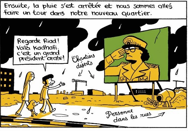 Dans l’Arabe du futur le récit à hauteur d’enfant nous fait découvrir sans aucun recul la Libye égalitariste de Kadhafi où toutes les maisons sont gratuites (et dépourvues de verrou) et le ravitaillement aléatoire, les décisions politiques instables ou bien la Syrie d’Assad, avec ses véhicules défoncés et ses maisons jamais terminées.