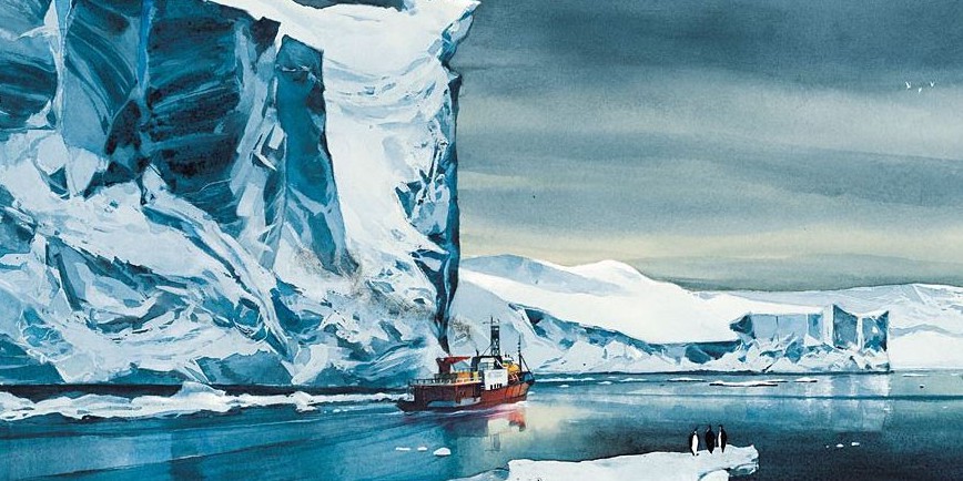 Mêlant peintures et photos, remarquablement entrelacées, éléments historiques et récit contemporain, interviews, peintures de trognes et considérations techniques sur les véhicules du raid ou la station Concordia, il s’agit là d’un magnifique reportage sur ce que c’est que l’Antarctique maintenant, avec les rêves qui y sont associés (Shackleton, Charcot, Paul Emile Victor…). Le dessin et la peinture permettent de lier ces dimensions