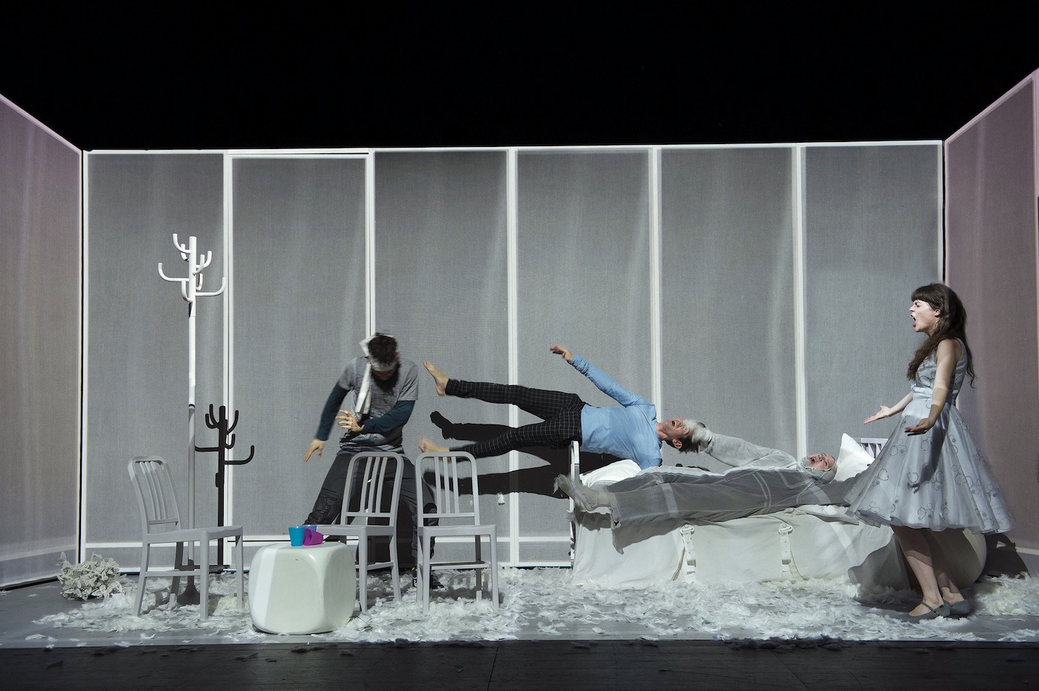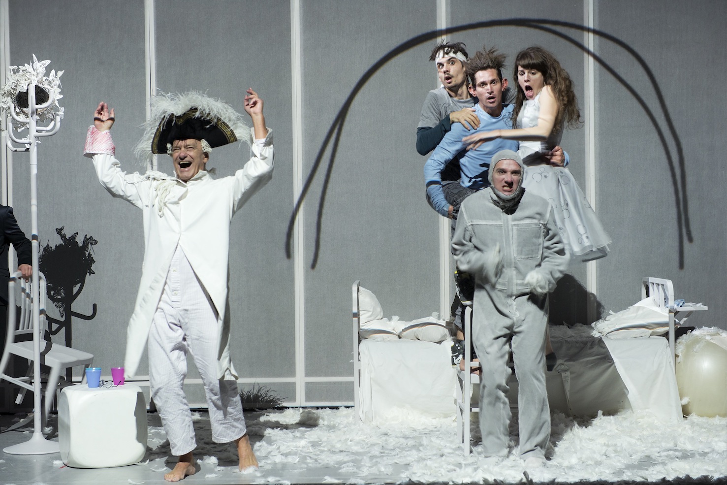 Le vieux, c’est le baron de Münchhausen, 296 ans, qui a séduit toutes les infirmières, délire sur son lit, saute, rit, pète, fait des jeux de mots et fait fuser les paradoxes comme des feux d’artifice. Au bout de quinze minutes de représentation, le vieux est mort, le fils rentre dans son studio tout pourri sous les toits et l’histoire commence à exploser, avec l’aide soignante qui rêve d’astrophysique, le meilleur pote qui ne rêve de rien, le fils qui ne comprend rien, le cheval Bucéphale dans le cimetière, le voyage à Gibraltar, en passant par la lune et le Vésuve. Münchhausen ?, ce n’est pas une adaptation des aventures du célèbre baron, c’est une rêverie dans tous les sens, une histoire de joie, de deuil, de vie et de mort, une ode à l’illimité. C’est du théâtre moderne, explosif, à l’écriture speedée (la série Bref de Canal n’est pas loin, c’est peut-être la seule petite limite du truc), qui ose les effets spéciaux délirants, les blagues étranges, le surréalisme. Les acteurs sont tous formidables. C’est du théâtre pour enfants. C’est du grand théâtre.