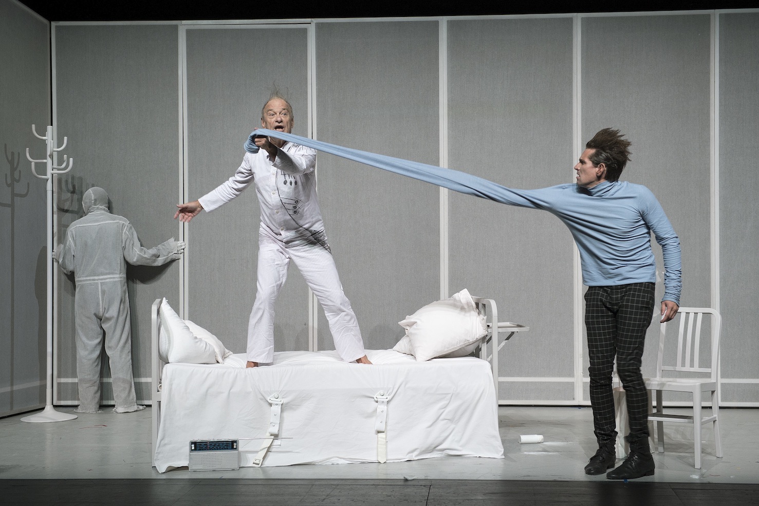 Une chambre d’hôpital, toute blanche. Un vieux hirsute, à moitié dingue, sur le lit. Dans le coin, un étrange mannequin. On sent presque l’odeur des médicaments, et les exhalaisons corporelles pas très nettes du vieux, à qui son fils, qui fête ses trente ans aujourd’hui, vient rendre visite à contrecoeur.