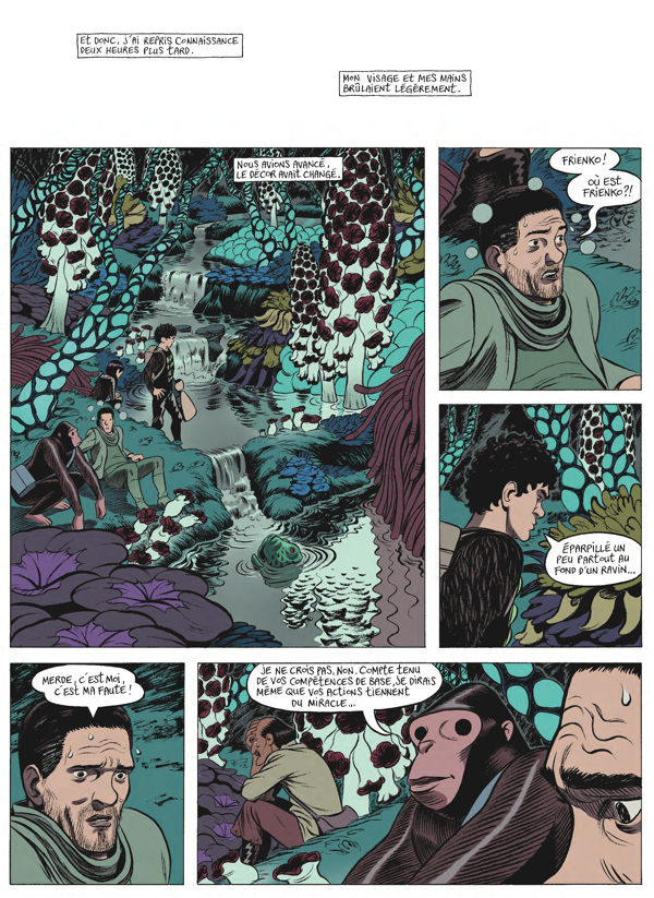 Il y a des trucs que Peeters réussit formidablement : la faune et la flore extraterrestre bizarre, les décors insolites et grandioses ™, les personnages qui sonnent juste, les scènes d’actions flippantes et hallucinantes (celle qui ouvre le tome 3 est un modèle), et le fait de clôturer une série en quatre gros volumes. Et les robots singes.