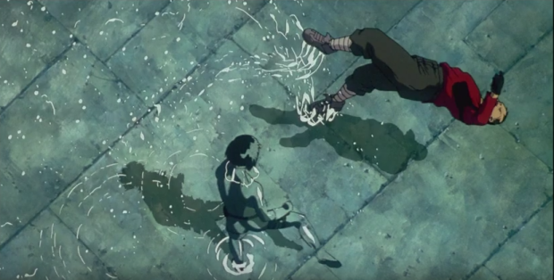 Lors du re-visionnage, j’ai été frappé par le traitement du corps du major Kusanagi. Elle apparaît souvent nue (dans très belle séquence du générique ou quand elle porte sa sorte de double-peau qui la rend invisible) et elle n’est pas attirante au sens conventionnel. Elle dégage autre chose, une forme de perfection physique et de puissance froide, comme si, malgré la couverture de chair artificielle, on parvenait à distinguer le cyborg. Et la scène où le robot se déchire et se détruit lors du combat contre le tank m’a pris aux tripes.