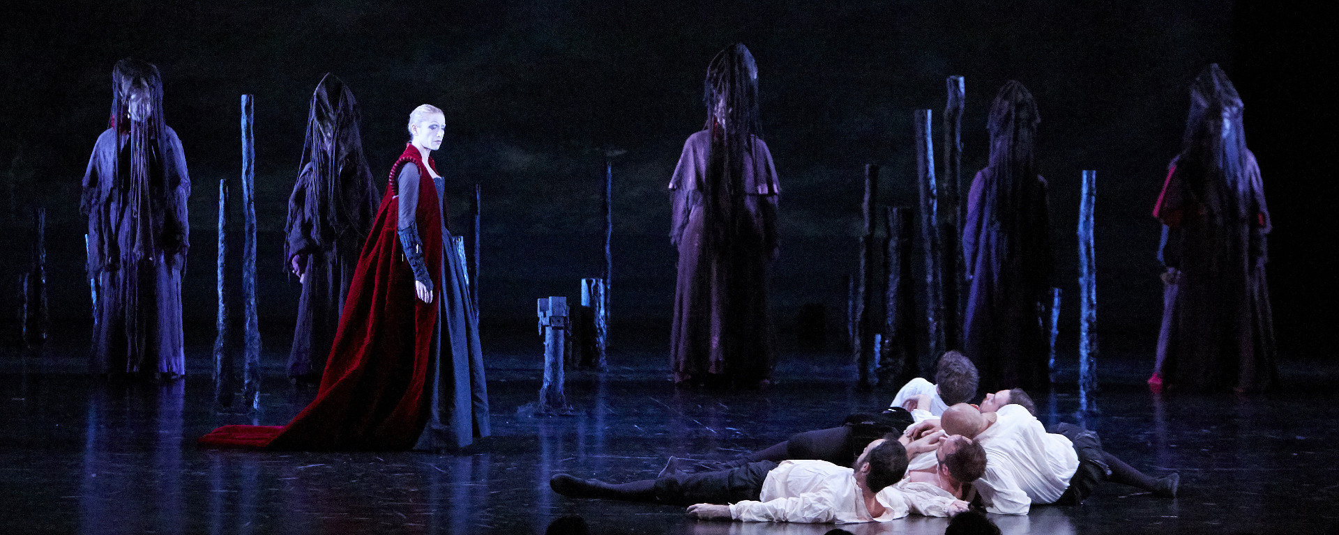 Cecci a aussi aimé la mise en scène, très lisible, bien rythmée (deux heures vingt sans entracte), avec de très belles images: la gondole au petit matin avec les filles et les hommes en vrac tout autour, Lucrèce avançant sur des planches d’aqua alta, le palais Borgia avec ses lettres énormes et l’horrible et malsaine danse finale de Gubetta avec les amis de Gennaro, tous empoisonnés, jusqu’à l’image finale morbide avec les corps abandonnés contre les poteaux. Waow !