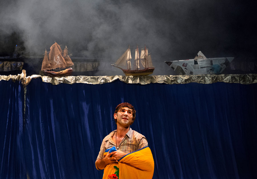 J’ai aimé les costumes flashy, les grandes couronnes des rois, la musique sur scène jouée par les acteurs, le prince et la princesse déguisés à la fois ridicules et touchants, les chansons en italien de l’escroc, les personnages transformés en marionnettes à la fin quand on n’a plus trop le temps de raconter les retrouvailles, les maquettes de bateau, la mise en scène de l’ours.
