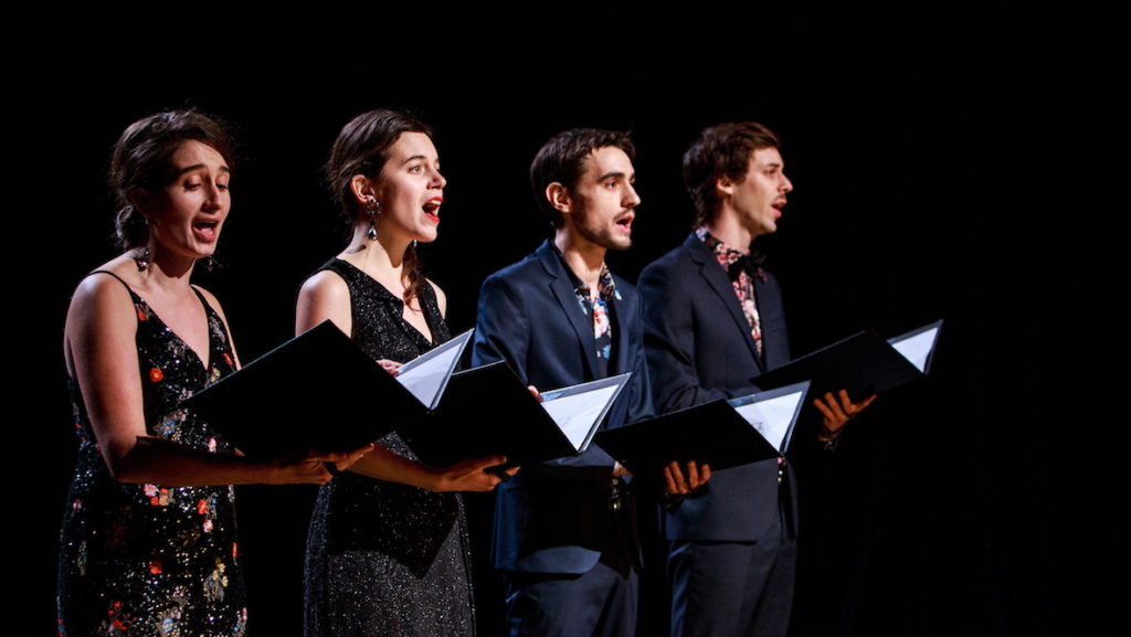 Le récital déraille un peu, puis un peu plus. Dans le comique, dans le bizarre, dans l’inquiétant. Il n’y a pas d’histoire à proprement parler, juste des choses qui se passent sur scène, des effets, des sentiments, des accumulations de voix, des scènes dialoguées… Les chanteurs deviennent comédiens, des situations absurdes apparaissent, on rit parfois, on est perplexe, on rit plus, on est de plus en plus perplexe… La mise en scène (et en lumières !) est habile, on est saisi, et à la fin, curieusement, on entend vraiment la montagne, là, dans notre petite salle de théâtre. La montagne, ses silences et ses peurs. On part des chansons, on arrive à Derborence.