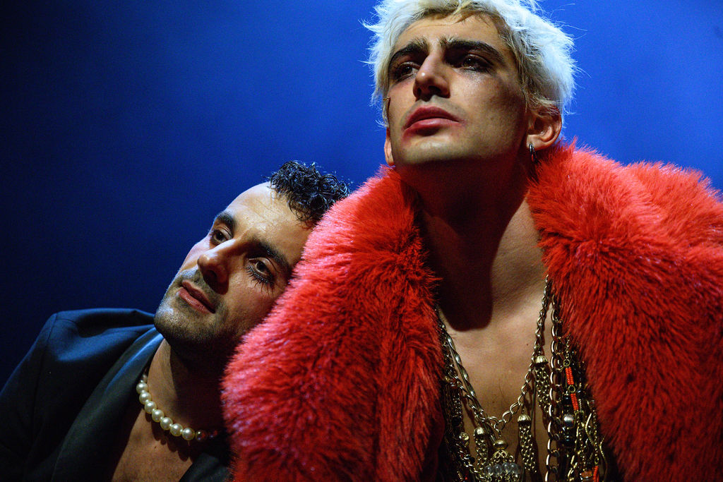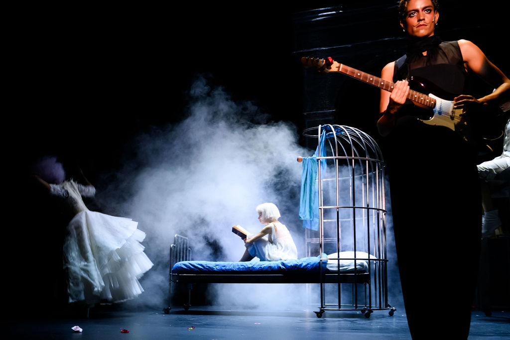 La mise en scène de Laurent Natrella avec huit jeunes comédiens est formidable. Le début m’a fait un peu penser au Roméo+Juliette de Baz Luhrmann : silhouettes stylées, maquillées, aux genres fluides, avec une sorte de Mercutio androgyne super stylé.e en narrateurice (qui ponctue le récit de chansons et de passages musicaux).