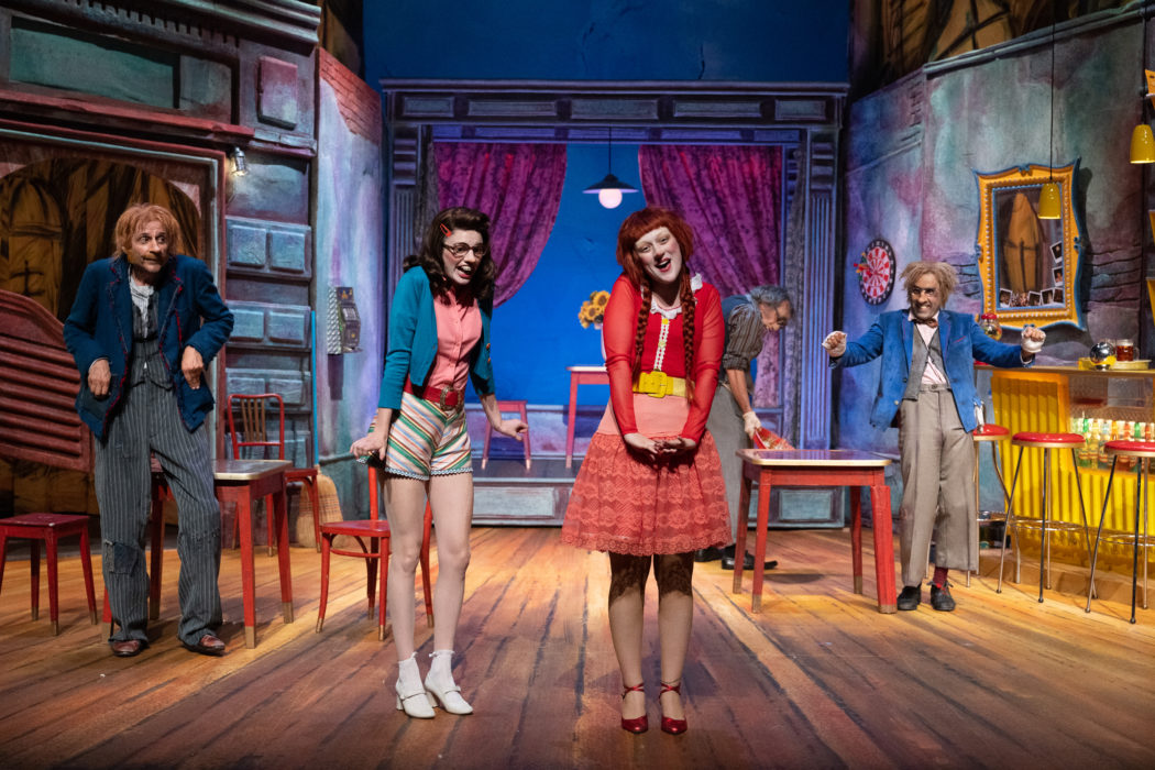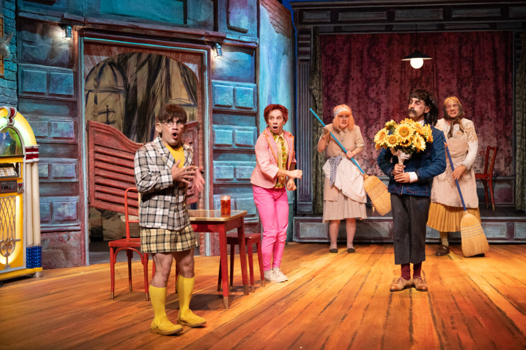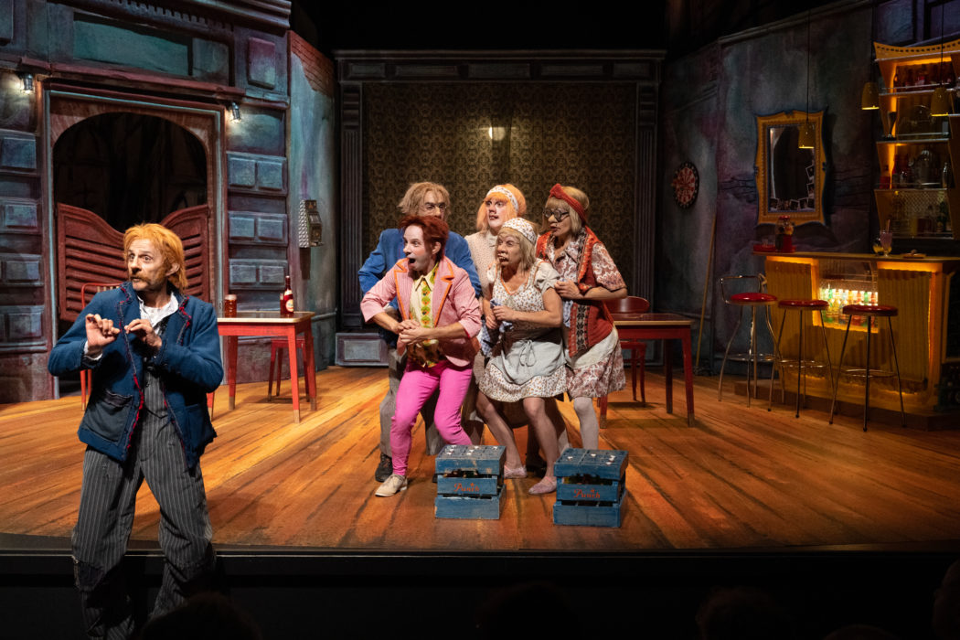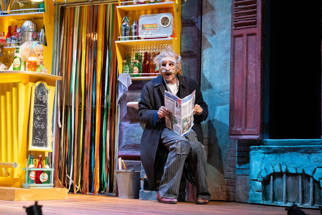 Donc ça se passe dans un bar, ou une cantina, ou je ne sais quoi. C’est un endroit coloré, criard, avec des espèces de triplettes de Belleville au service. Les personnages sont tous laids et exagérés, bougent comme des marionnettes. Argante est un petit vieux avec une grande cravate et des lunettes années 80, Géronte est une femme permanentée et avide, Hyacinthe porte un appareil dentaire, Léandre est un petit crétin épais qui lit entre sur scène avec un magazine de Q, Octave est une jeune imbécile touchant en pantalon moulant rose, et là vous vous dites : festival de mauvais goût et d’outrance, et c’est vrai.