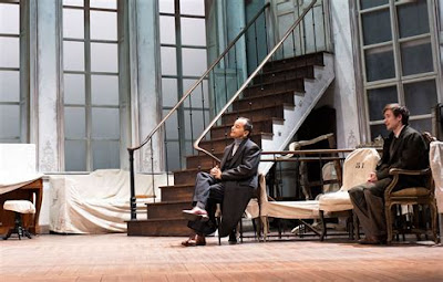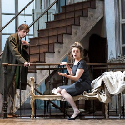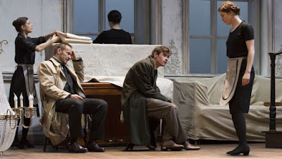 La mise en scène de Clément Hervieu-Léger se passe dans une sorte d’espace intermédiaire, le salon d’un hôtel particulier en cours de rénovation ou de déménagement. Il y règne une ambiance sombre de lieu mi-habité, avec ce piano dont Alceste joue parfois quand on tire le drap qui le recouvre.