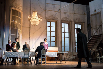 Je n’ai pas beaucoup de sympathie pour ces costumes sinistres de bourgeois début de siècle (l’autre siècle, celui où je suis né) et ces soubrettes en robe noire et tablier blanc, mais je trouve que la pesanteur qu’ils inspirent participe bien du cadre de la pièce. De plus, ces costumes sombres font ressortir les couleurs des deux personnages les plus sympathiques de la pièce, Eliante et Célimène.