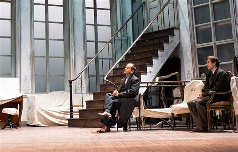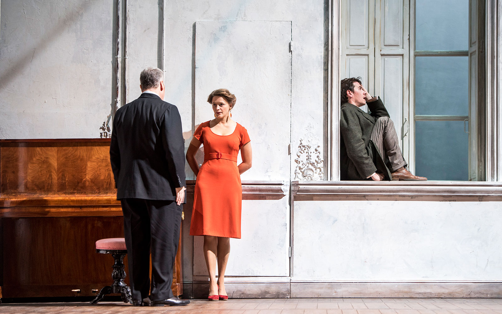 La mise en scène de Clément Hervieu-Léger se passe dans une sorte d’espace intermédiaire, le salon d’un hôtel particulier en cours de rénovation ou de déménagement. Il y règne une ambiance sombre de lieu mi-habité, avec ce piano dont Alceste joue parfois quand on tire le drap qui le recouvre.