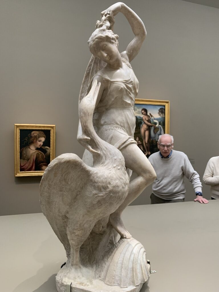 Plusieurs oeuvres montrent Leda et le cygne. Ici, on danse et le cygne pas très cygne pince la tunique pour la tirer bas. Bizarre accouplement zoophile à suivre.