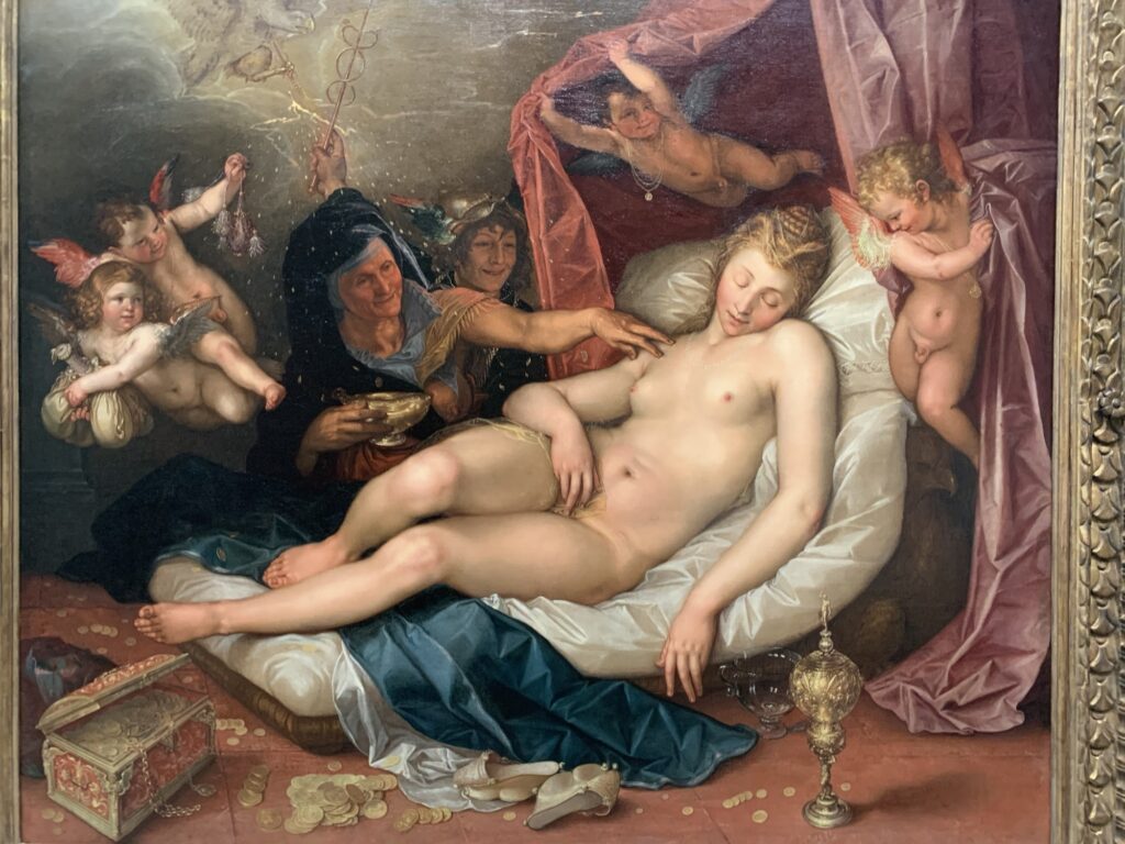 Variante autour de Danaé. Le pluie d’or devient bien moins abstraite (= c’est du POGNON) et il est assez clair qu’on vend là l’innocence de la demoiselle posée au milieu.
