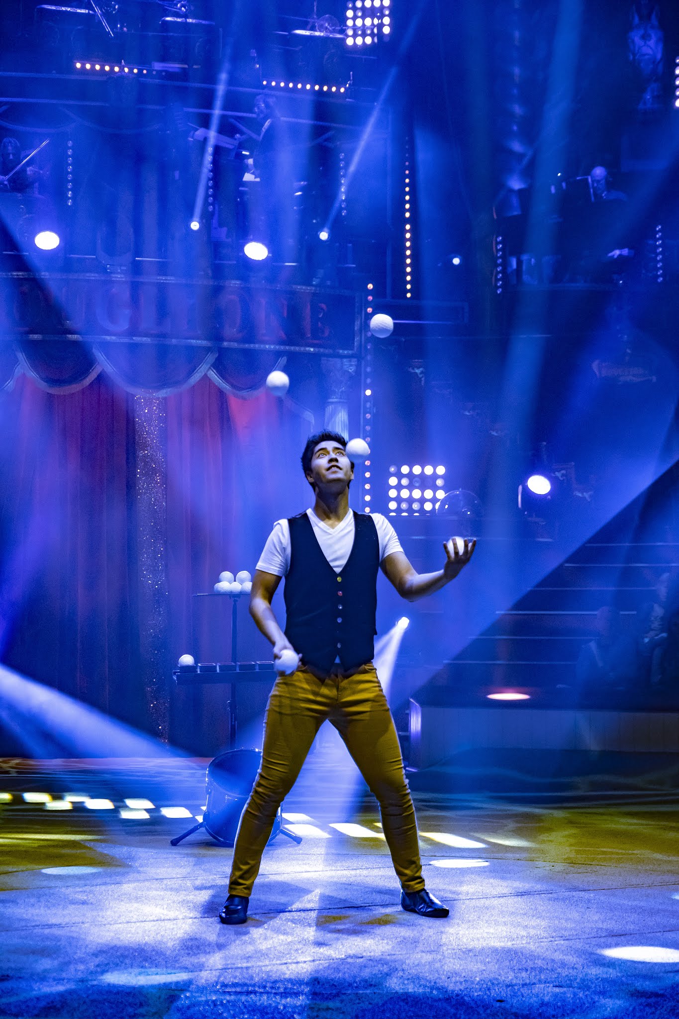 Enfin, Sampion Bouglione fait un très mis en scène numéro de jonglage de balles + claquettes qui marche très bien, notamment dans les moments de silence créés par l’orchestre.