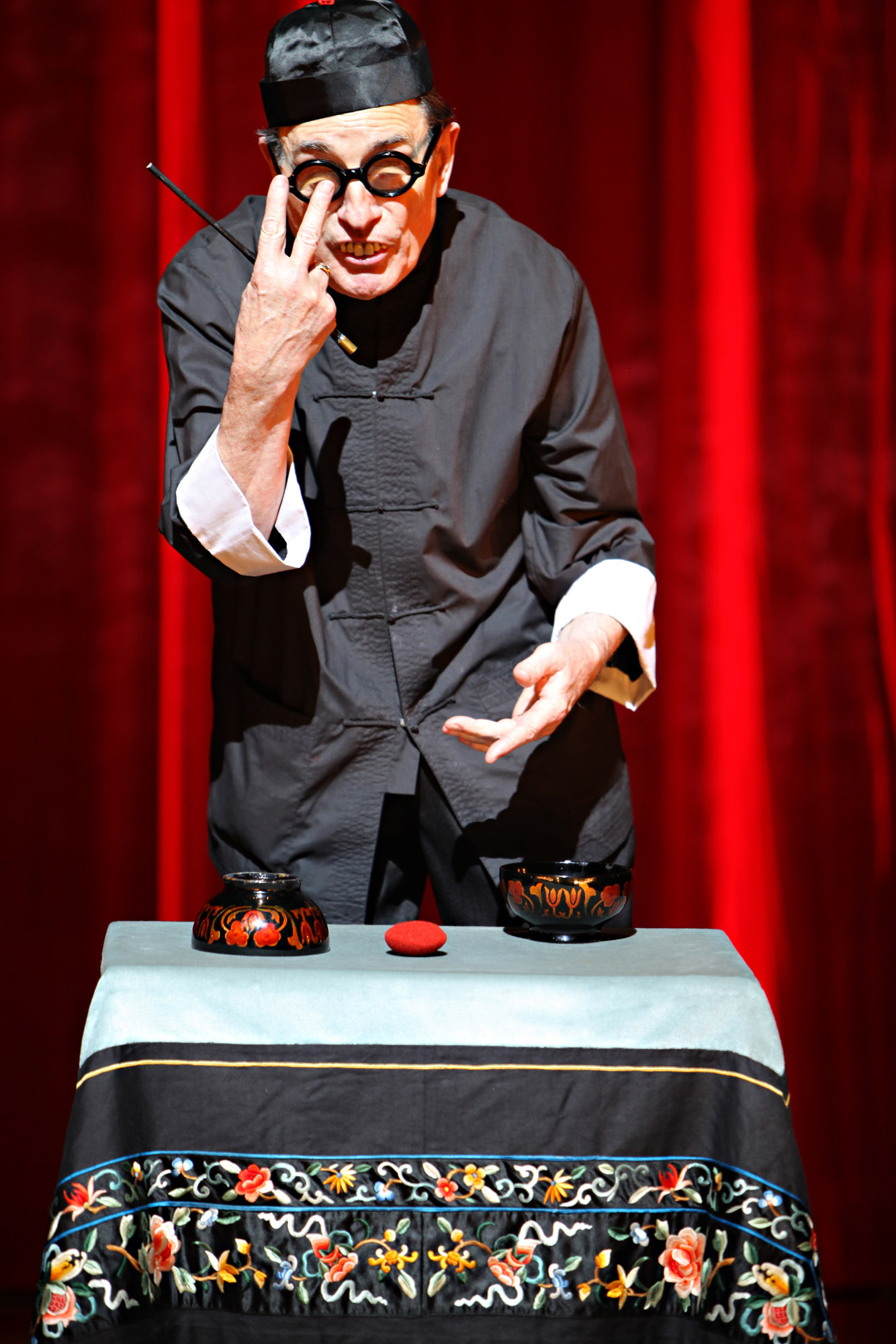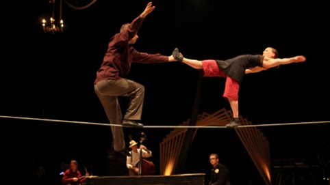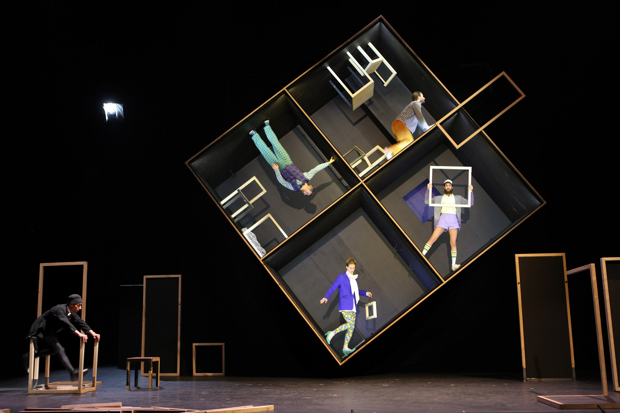 Le spectacle tient de la danse, du cirque et de la magie : sauts, acrobaties, manipulations, disparitions. Les idées sont très nombreuses : comment mettre une femme dans une boîte, comment tenter de faire tenir tous les personnages dans le cadre, comment s’asseoir sans tomber, comment tenir debout quand la maison tourne ?
