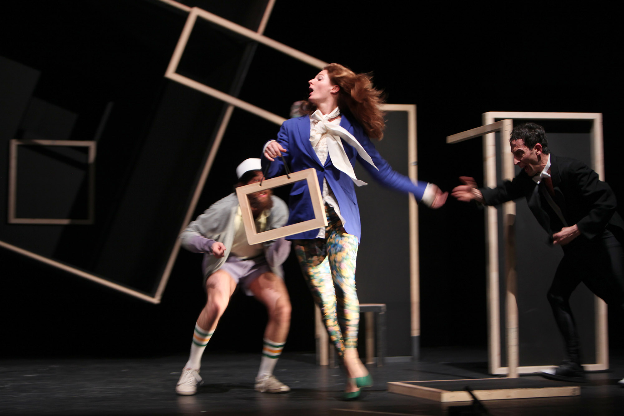 Une scène noire, un DJ arrange des bruits de foule, des nappes, de la musique symphonique. Des tiges des balsa dessinent portes et fenêtres. La lumière vient, des personnages se mettent à danser, mais certains n’ont ni bras, ni tête, on met du temps à s’apercevoir qu’il s’agit de marionnettes. Plus tard, les corps des artistes se détachent de ceux des créatures qu’ils incarnent, quatre hommes et deux femmes aux démarches bizarres, aux habits criards, leur assemblage a quelque chose de dissonant, d’autant qu’ils se découpent sur un décor hyper géométrique de carrés et de rectangles.