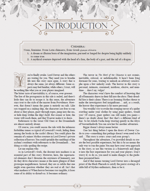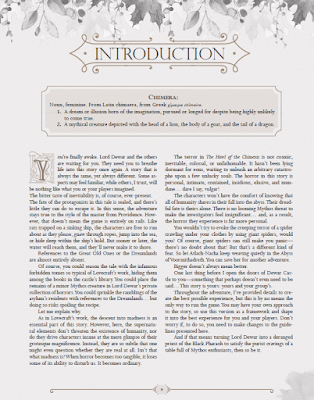 The Howl of the Chimeras est un livre de scénario d’environ 200 pages pour L’Appel de Cthulhu, publié par l’éditeur espagnol Shadowlands Games et écrit par Albert Estrada. De manière intéressante, Shadowlands Games publie à la fois en anglais et en espagnol.