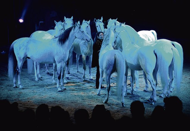 La double poste hongroise d’Ivan Knie et Wioris Errani était splendide (superbes chevaux et beaux écuyers) mais le clou était le numéro de carousel de la première partie, avec trente chevaux sur la piste, qui m’a bouleversé comme rarement, un de mes plus beaux moments de cirque. C’est pour ces quelques secondes grâce, où les chevaux, l’écuyer, les lumières produisent des images merveilleuses que j’aime aller au cirque.
