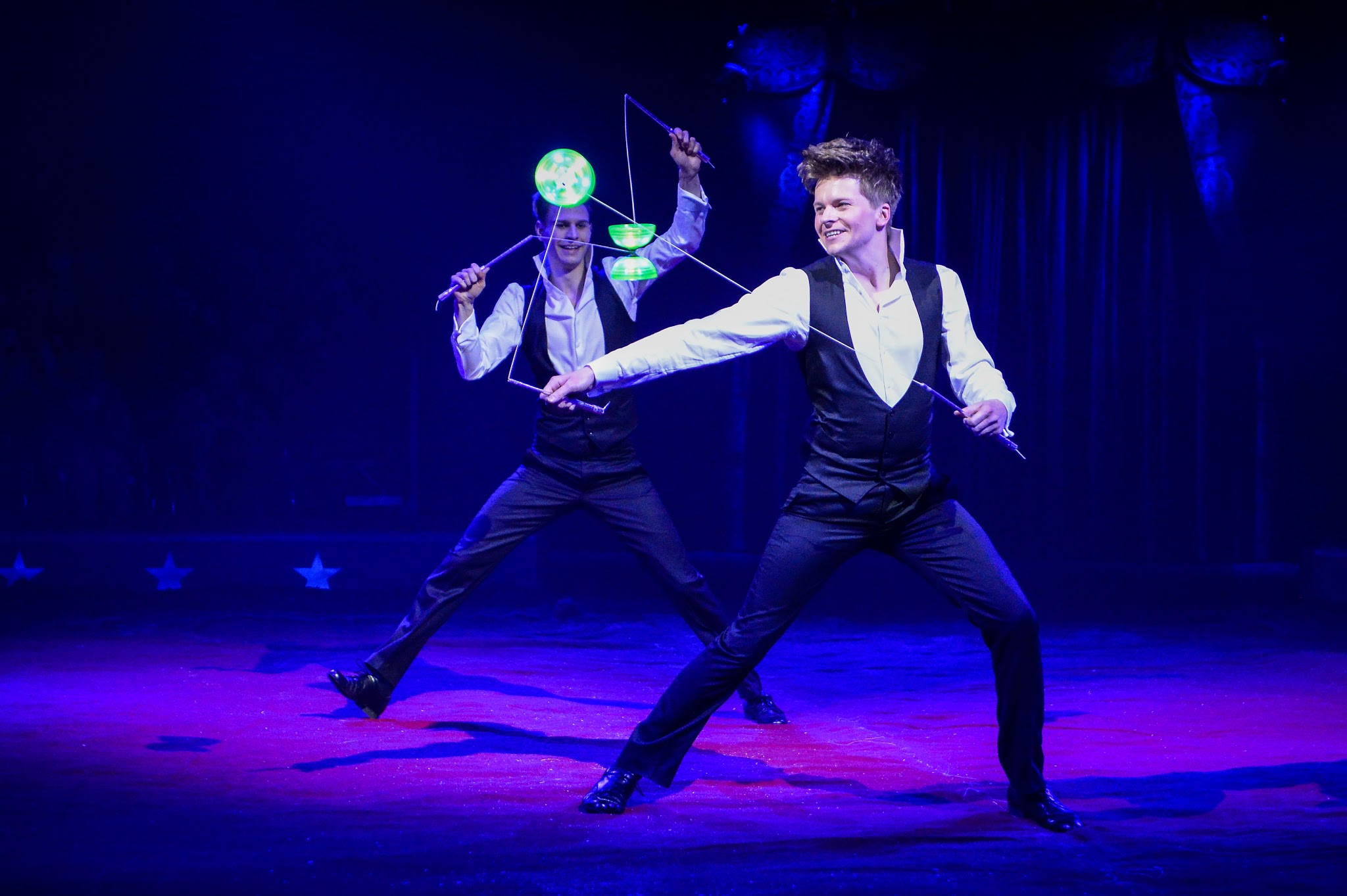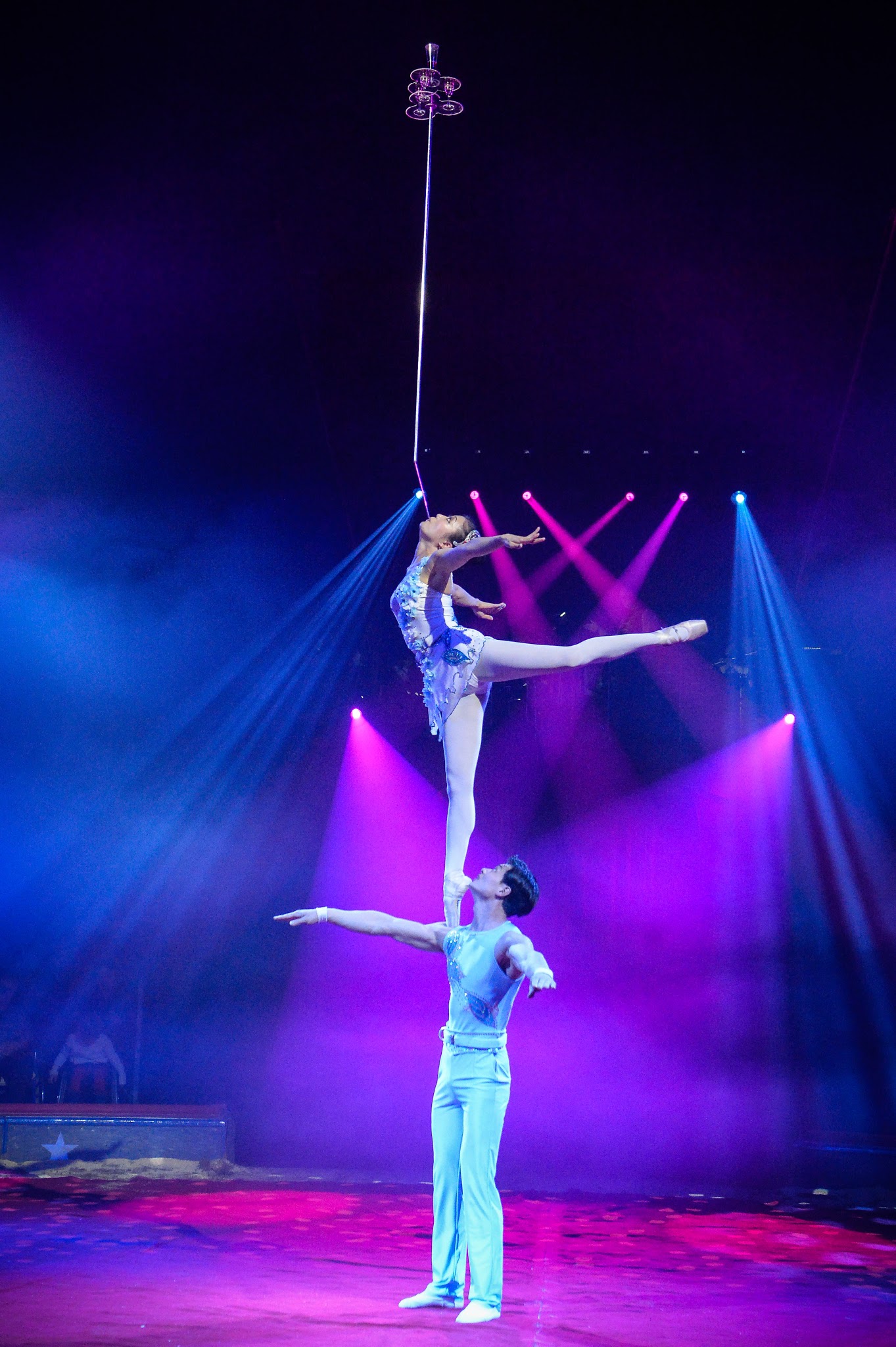 Ces deux costauds roumains forment le duo Ballance et mon numéro favori du spectacle de cette année. C’est un numéro de portés (j’explique simplement : le costaud 1 – 90 kilos au moins est porté par le costaud 2 – 100 kilos de muscles pendant tout le numéro). N’allez pas regarder la vidéo qu’on trouve sur youtube (le cirque ne rend rien en vidéo, on perd toute la beauté, ne reste que des images crues et froides), croyez-moi simplement : voir ces deux hommes, l’un portant l’autre, bouger avec force et lenteur dans des rayons de lumière bleue, m’a procuré une immense émotion.