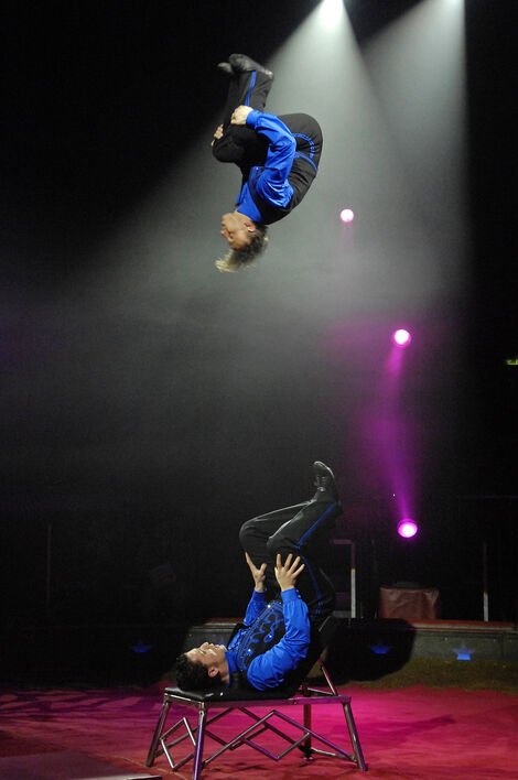 | La troupe de danseurs acrobates Bingo, qui fait l’ouverture du spectacle depuis des années, avec toujours la même efficacité énerigue. |