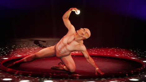 Le jongleur-danseur ukrainien Viktor Kee a créé un personnage extraordinaire, une silhouette extra-terrestre (son costume était différent, meilleur que celui de la photo ci-dessus). La mise en scène lumières de son show était magnifiques, avec une pluie d’étoiles projetées sur son corps et autour de lui, donnant l’impression d’un personnage irréel et transparent. Il a commencé par danser avec une boule lumineuse (ondulations et jeux d’immobilités) avant de recevoir du ciel ses balles de jonglage, de une à cinq. Un numéro de très grande classe.