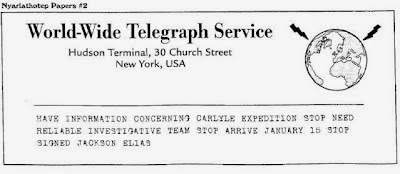 Trois mois d’absence… C’est le temps qu’il faut à Nyarlathotep pour traverser les Etats-Unis à pied, du Texas jusqu’à l’Etat de New York, suivi par la foule dont il conditionne peu à peu l’état psychique. Erica Carlyle sait que c’est pour elle qu’il vient. Déjà les journaux oublient qu’elle est déjà mariée et annoncent ses prochaines épousailles, comme si cet événement mondain allait être la clef mystique qui sortirait l’Amérique de la grande crise. Utilisant sa fortune, Erica jette dans les pattes du gourou tous les obstacles qu’elle peut imaginer. Chicaneries juridiques pour empêcher sa foule de traverser des villes ou des états, jusqu’à organiser une réception du grand homme par le Sénat des Etats-Unis… Mais à la mi-septembre, Nyarlathotep se présente devant le manoir Carlyle et ses partisans campent tout autour. On ne lui ouvre pas. Un à un les soutiens de Mrs Carlyle craquent sous la pression psychique. Les télégrammes affluent venus des personnages les plus influents du pays : il faut, pour l’intérêt de tous, qu’elle épouse le Maître…