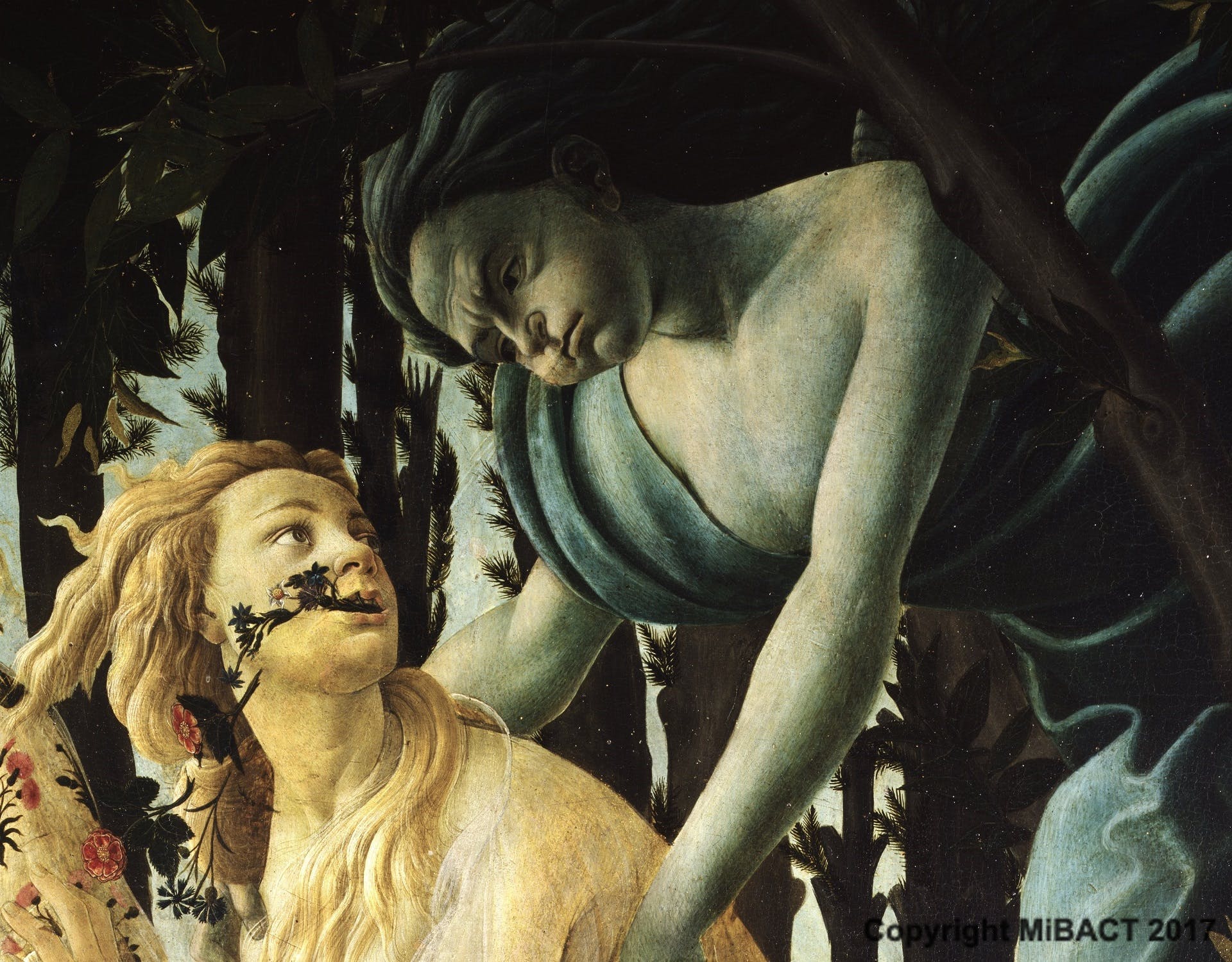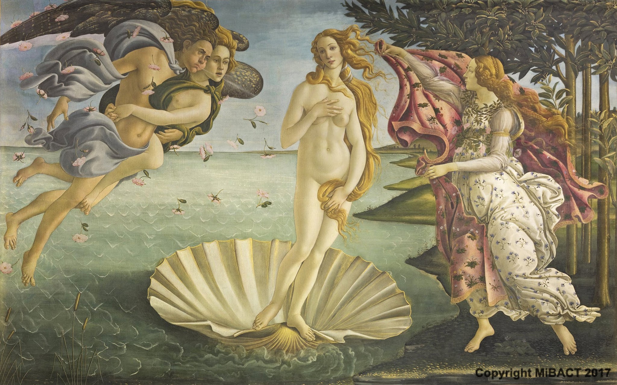 Encore plus que le précédent, ce tableau est une image hyperconnue. Pourquoi le voir en vrai ? Là aussi, il est grand et il vous absorbe, on y entre. Venus, au centre, attrape tous les regards, l’air de rien, l’air de ne pas y toucher. Elle se masque à peine, juste ce qu’il faut pour que personne ne se mette en colère de la voir ainsi. Ses cheveux d’or ruissellent. Elle ressemble à une idole de maintenant, souriante et vaguement absente à ce qui se passe. Sur la droite du tableau, son assistante, qui la voile, qui la dévoile ?, et sur la gauche un ange, un esprit aérien, c’est peut-être le même que dans le printemps, d’ailleurs il porte une femme accrochée à lui, finalement il ne l’a pas enlevée ?